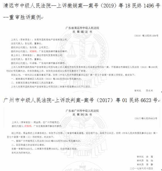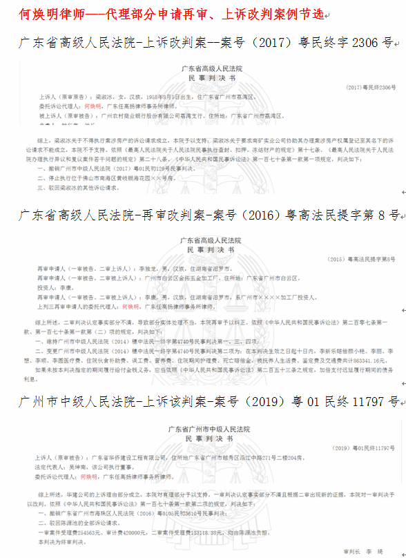 何焕明律师--代理部分申请再审、上诉改判案例节